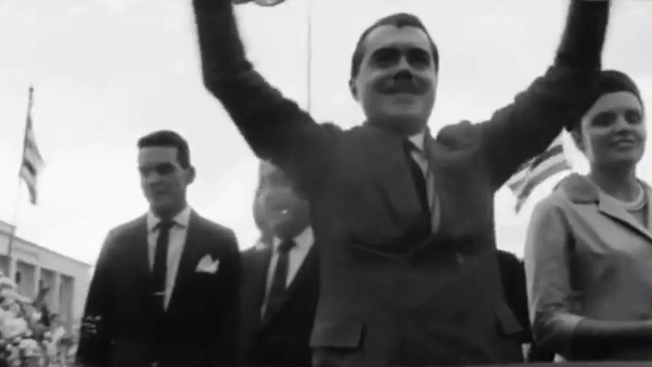 Posse de José Sarney, governador do Estado do Maranhão. Ao discurso do político eleito, opõem-se as imagens das mazelas sociais e demais problemas crônicos do Estado nordestino: famintos desassistidos, casas miseráveis e doentes desamparados. (Cinemateca Brasileira)