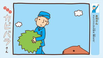 Kapibara-san vive com seus amigos na Campina Midorino. Ele gosta de entrar em banhos termais e de pastar. Quando não está fazendo isso, ele geralmente está olhando para o nada ou dormindo feito uma pedra.